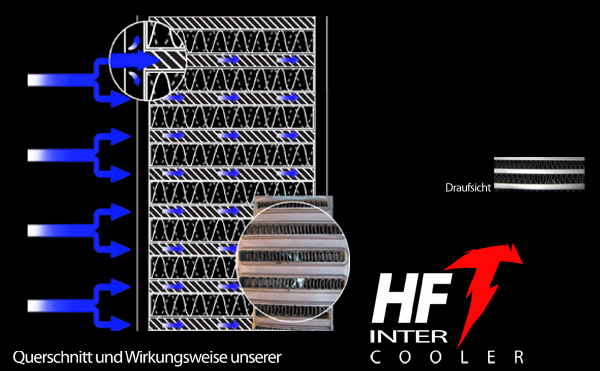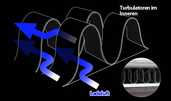 Unterstützend dazu sind die Lamellen in den Ladeluftführungen, den so genannten Turbulatoren, versetzt zueinander angeordnet (siehe Zeichnung unten rechts), was wiederrum die Ladeluft wirkungsbedingt bremst.