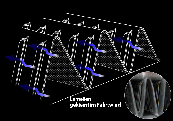 Dies hat zur Folge, dass der Fahrtwind abgebremst wird und langsamer durch den Kühler strömt, somit also länger ein effektiverer Wärmeaustausch stattfinden kann.